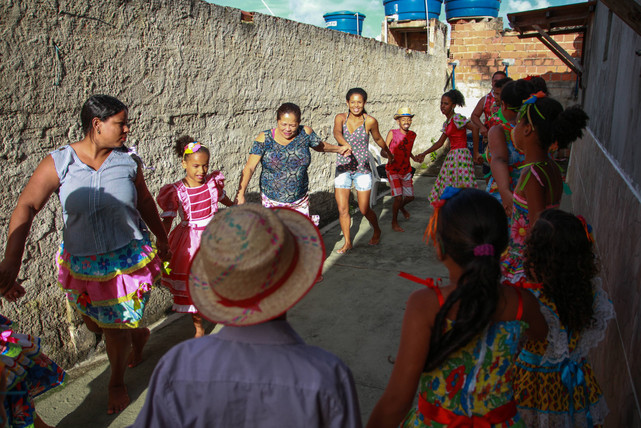 As tradições juninas embalaram a tarde do dia 25 de junho, no Centro Social Madre Maria Rosa (CSMMR), em Maceió. As crianças, adolescentes e familiares atendidos pela instituição participaram de diversas atividades realizadas no Dia de São João, que celebra uma data muito importante para a cultura e para o povo nordestino. As músicas do coco de roda - dança cantada típica do folclore alagoano - contagiaram os passos e o gingado dos integrantes, formados pelos pais e pelas próprias crianças do centro social. Ao ritmo dos batuques na zabumba, instrumento de percussão utilizado no folguedo, dançaram canções marcantes do festejo junino, como “Balanço do Ganzá”, “Rala Buxo” e “No Tempo Que Eu Era Só”.